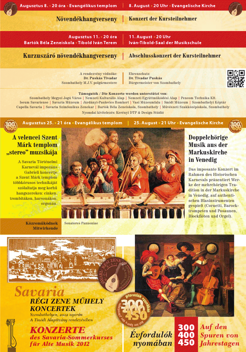 Egyre növekszik az igény a régi zenék stílusos, korhű előadására. Erre teremtett lehetőséget Szombathelyen évekkel ezelőtt a Savaria Régi Zene Műhely. Idén az előző évekhez hasonlóan a város Fő terén álló ferences kolostor épületében, az Assisi Szent Ferenc Kollégiumban kezdődik a műhelymunka augusztus 3-tól. A nagyközönség augusztus 8-án egy növendékhangverseny keretében hallgathaja meg a zenészeket az evangélikus templomban. A rendezvényt kísérő koncertekről a következő plakátokon tájékozódhatnak: