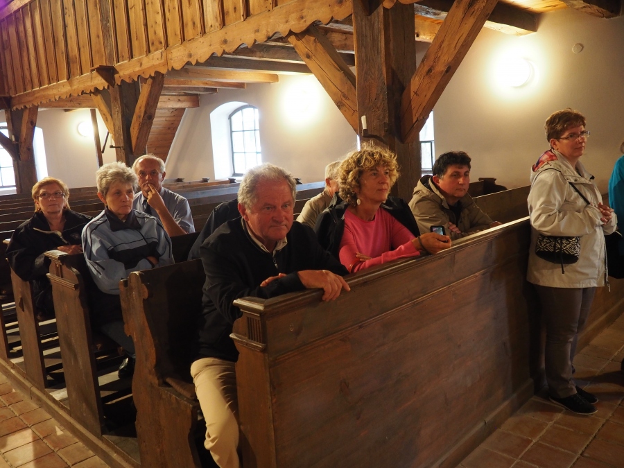 Következő programpontunk az evangélikus templom volt, ahol Frank Lissy-Honegger helyi lelkész fogadott bennünket. Ismertette a templom építésének történetét, beszélt a gyülekezetről. Torma-Hasza Mónika hagyományainknak megfelelően rövid áhitatot tartott.