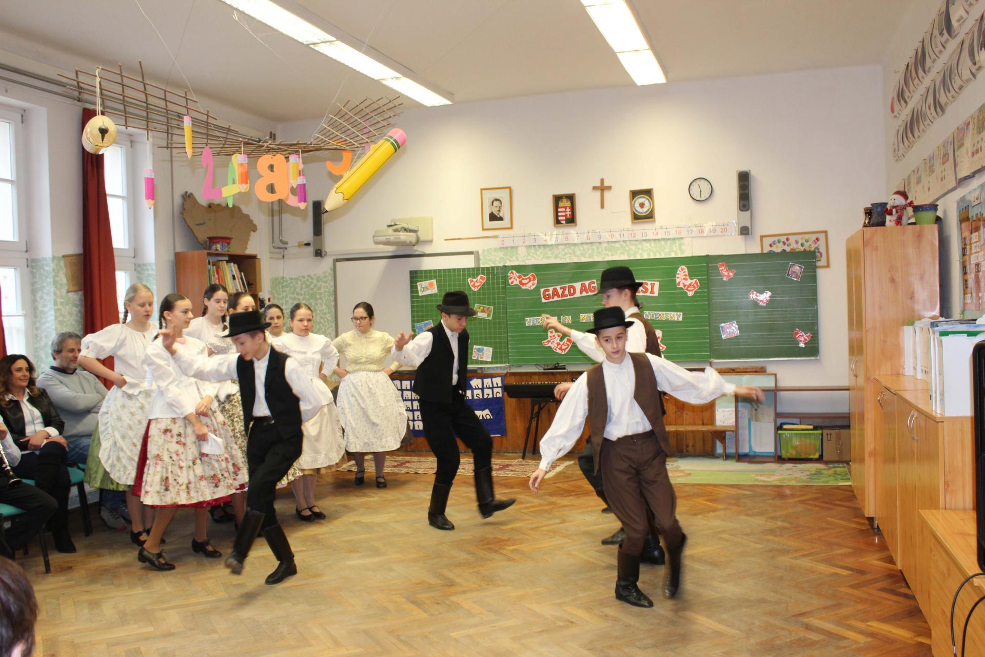 A rendezvényünket néptánccal is színesítettük: iskolánk Berbécs Néptánccsoportja a „Tyuhaj, sarkam, add föl a talpam!” című összeállítással vidám perceket szerzett a közönségnek.