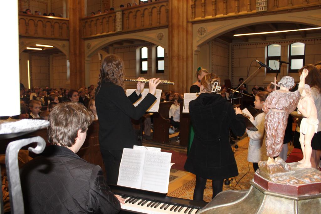 A zenekarban közreműködtek volt tanítványaink, Borsics Anna és Badics Dóra fuvolán, Simon Benedek zongorán.