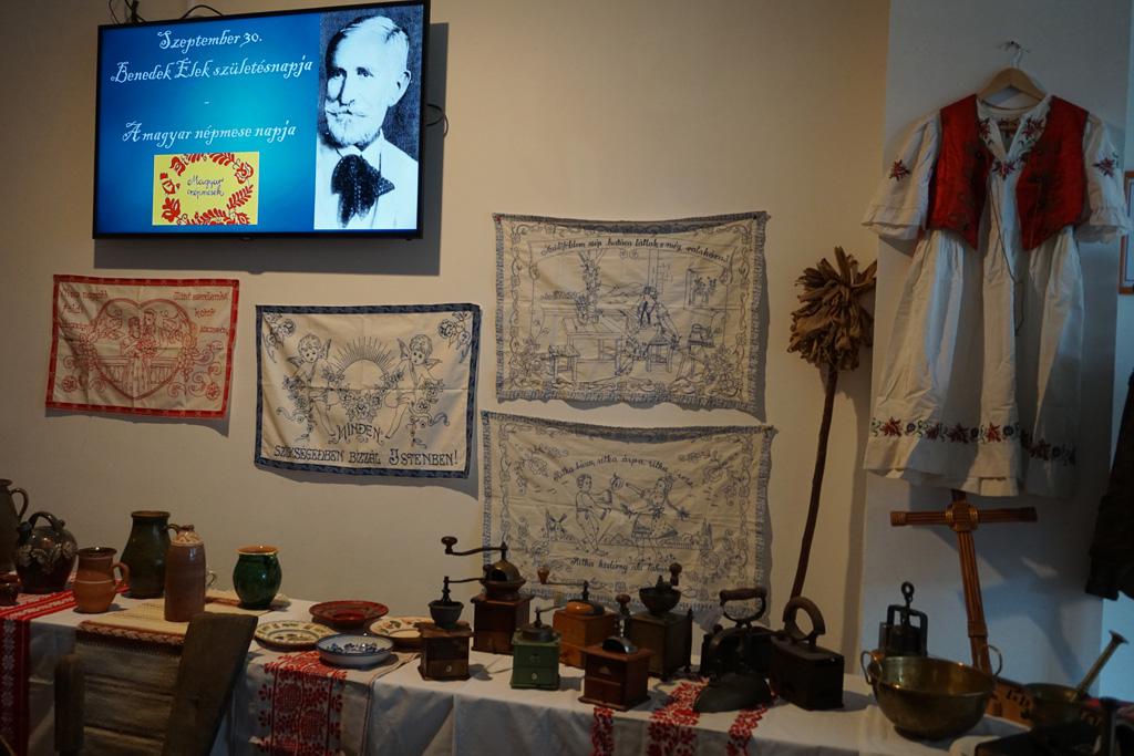 Az iskola aulájában egy kiállítás is nyílt, ahol a gyerekek és a hozzánk érkezők megcsodálhatják a népmesékhez kötödő eszközöket.