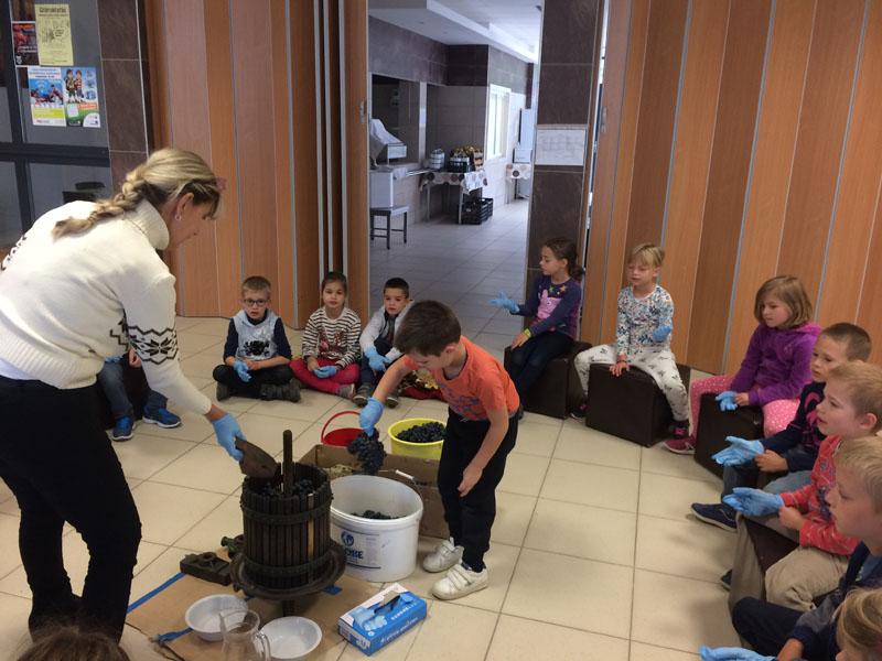 Rendhagyó környezet óra keretében szüretelt az 1.a osztály. A gyerekek megfigyelhették és kipróbálhatták a szőlőpréselést, sőt mustot is kóstolhattak.