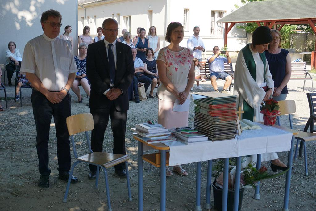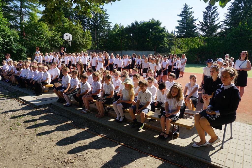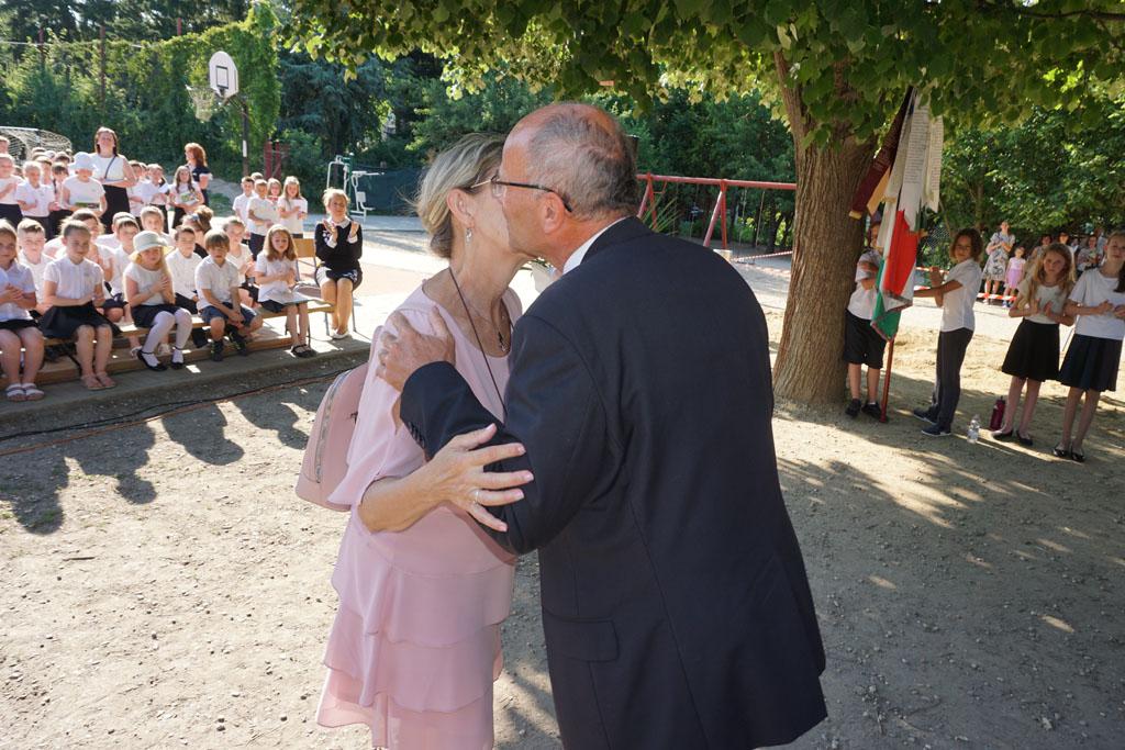 Az alsó tagozatos osztályoknak is rendhagyó módon az iskola műfüves pályáján tartottuk a tanévzáró ünnepélyt, melynek során kihirdetésre kerültek az iskolai jutalmak is. Az oklevél és könyv jutalmakat az iskola alsós közössége és szüleik előtt vehették át a tanulók, az oklevél jutalmakat a bizonyítványosztással együtt kaphatták meg a jutalmazottak. Az ünnepségen vehették át elismerő okleveleiket a Zrínyi matematika verseny díjazottjai is. Búcsúztunk két nyugdíjba vonuló pedagógusunktól, Kozma Györgyi és Németh Gyöngyi tanárnőktől.