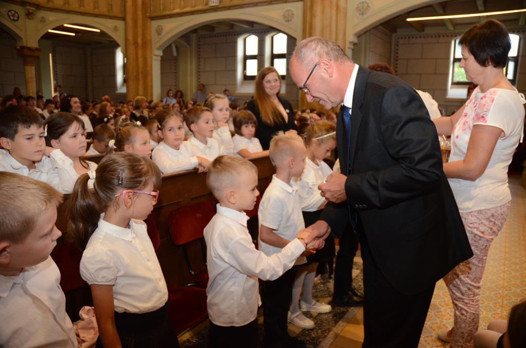 Sátory Károly igazgató köszöntötte a diákokat, s ismertette az intézmény új fejlesztési terveit, majd a kis elsősök átvehették az iskola jelvényét, a tanító nénik és az Evangélikus Nőegylet ajándékait.